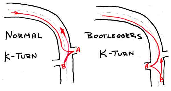 But the problem with the normal K-Turn is that the cop cars have a habit of crashing into you at point B. But with the Bootlegger’s K-Turn at point (B) you’re in the opposite lane from the cops so you have less of a chance of a crack-up.